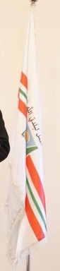 A white flag with a red-white-green-white-red stripe across the center and the logo overlain on that in the center.