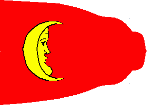 It is a red ogival pennant. A yellow, vaning crescent with human face is shifted to the hoist.
