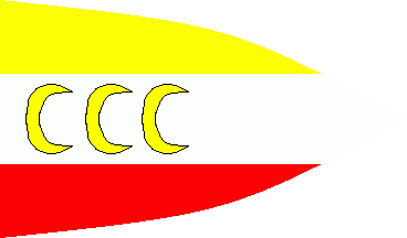 It is a yellow over white over red tricolour. In the white stripe of this ogival pennant are three yellow crescents shifted to the hoist.