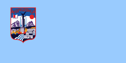 The flag is rectangular in shape, in length at least twice the height, light blue, with the coat of arms in the upper left corner.