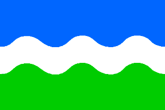 1973. Description: three horizontal wavy stripes of blue, white, and green,