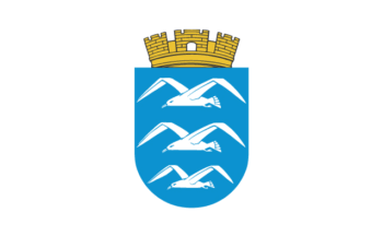 The ratio is approx 3:1. It is a white flag with the coat of arms shifted slightly to the top. The shield is topped by a golden (=yellow) mural crown with an open gate. The shield shows in a blue field three silver (=white) seagulls with golden (=yellow) beaks. They are ordered vertically. The lower seagull is a bit smaller.