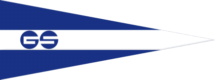 The flag of Gandesfjord Seilforening from Stavanger is a pennant horizontally striped blue-white-blue with two blue disks on the white stripes showing stylized letters GS.