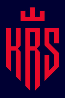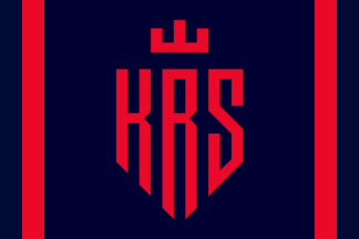 The flag of KRS Topphåndball or Kristiansand Topphåndball from Kristiansand is dark blue with the initials in red in the form of a shield. Horizontal flags also contain vertical red bars near the hoist and fly.