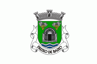 Shield Vert with base wavy of Argent and Azure, a porticus Argent garnished Sable, in chief two garpevines Or leafed Argent ordered per fess. Mural crown Argent with three visible towers (village rank) and white scroll (Bénard Guedes style) with inscription in black capitals "FREIXO DE BAIXO"
