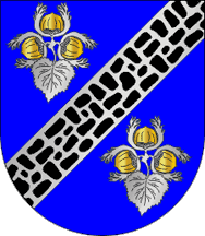 The shield is Azure a bend sinister Sable masoned Argent between two hazel twigs Argent fruited Or. Mural crown Argent with four visible towers (town rank) and white scroll reading in black upper case letters "AVELÃS DE CAMINHO". Sérgio Horta's image, matching all renditions I could find, even the official communal website shows (indeed Sérgio Horta's image!) what seems to be black cobble stones on the silver/white bend instead of the expected reverse pattern.