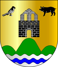 The mound is taken from the coat of arms of Carrazedo, the sparrow from those of Castrelos — there is a pig now, no cows, and the belfry was replaced by a bellless church façade without bells — even if blazoned as a belfry (Portuguese: campanário_»), it is shown with a door.