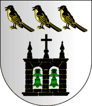Shield Argent; a two-arch bell tower Sable, topped with a cross between two pinnacles, masoned Or and with its bells and their counterweights Vert, in chief three sparrows Sable set in fess, emphasized Or and eyed Gules. Mural crown Argent with three visible towers (village rank) and white scroll reading in black upper case letters "CASTRELOS"
