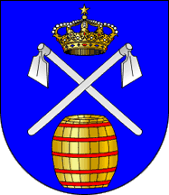 Shield Azure a Marian crown Or cushioned Gules lined Gules and bejewelled Proper flanked by two pairs of wheat ears Or with their stem tips tied Gules, on a mound Argent issuant from base three bottles Sable facing dexter and set in fess per counterchevron. (village rank) and white scroll reading in black upper case serifed letters "".