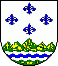 Shield Argent four fleurs-de-lis Azure ordered 1:2:1, on base a ridge Vert garnished Or with five peaks superimposed by a bar wavy of Argent over Azure over Argent.
