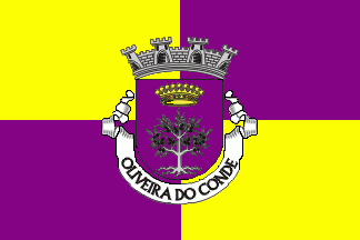 Shield Purpure, an olive tree eradicated Argent fruited Sable, in chief a count's coronet Or gemmed Gules and Vert. Mural crown argent with four visible towers (town rank) and white scroll reading in black upper case letters "OLIVEIRA DO CONDE".