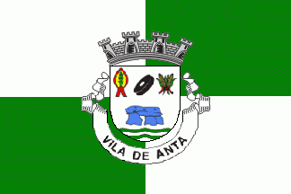 Shield Argent with base wavy of Vert and Argent, a dolmen Azure, in chief a mitre Or garnished Vert and scarved Gules, a sinister bendy millstone Sable and a bunch of corn cobs Or leaved Vert and tied Gules. Mural crown Argent with four visible towers (town rank) and white scroll with inscription in black initials "VILA DE ANTA".