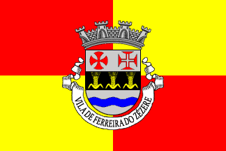 Mural crown Argent with four visible towers (town rank) and white scroll reading in black upper case letters "VILA DE FERREIRA DO ZÊZERE".
