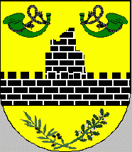 Shield Or, a throughout embattled wall Sable masoned Argent topped by a ruined tower of the same, in chief a hunting horn Vert tied Sable in each corner, in base two branches crossed per saltire, at dexter an olive branch Vert fruited Sable and at sinister an oak branch Vert acorned Argent capsuled Sable. Mural crown Argent with three visible towers (village rank) and white scroll with inscription in black initials: "VAIAMONTE".