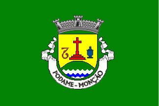 Shield Or with base wavy of Argent and Azure, crowned by a mountain issuant Vert, a calvary Gules flanked by a surgery tool of the same at dexter and a pharmacy's ballot box Azure at sinister. Mural crown Argent with three visible towers (village rank) and white scroll with inscription in black initials: "PODAME - MONÇÃO".