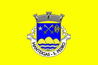 Shield Azure with base wavy of Azure and Argent crowned by a triplemount Or, in chief two keys -the bendy one Argent, the sinister bendy one Or- crossed per saltire flanked by a 5-point star Argent at dexter and a watermill's wheel Or at sinister. Mural crown Argent with three visible towers (village rank) and white scroll with inscription in black initials: "MANTEIGAS - S. PEDRO".