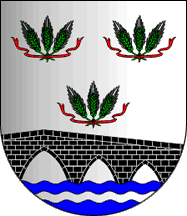 Shield Argent three triplets of wheat ears Vert tied Gules ordered 2:1, issunt from base wavy Arzure charged with a barrulet wavy Argent a throughout bridge Sable masoned Argent having three different arches. Mural crown Argent with three visible towers (village rank) and white scroll reading in black upper case serifed letters "VILA DA PONTE - MONTALEGRE".
