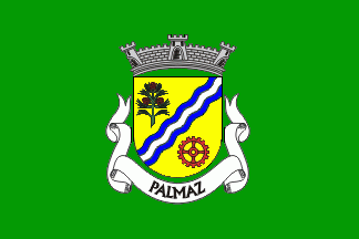 Shield Or, a bend sinister Azure charged with a bendlet sinister Argent, in dexter chief a pine branch Vert fruited Gules, in sinister base a cogwheel Gules. Mural crown Argent with three visible towers (village rank) and white scroll (Bénard Guedes style) with inscription in black capitals "PALMAZ".