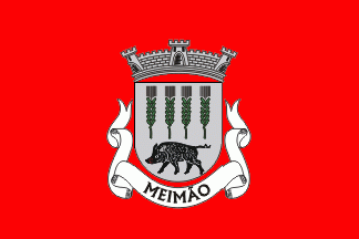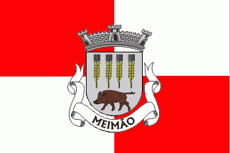 Shield Argent, four paly wheat ears Vert ordered per fess in chief, a boar passant Sable armed Gules in base. Mural crown Argent with three visible towers (village rank) and white scroll with inscription in black initials: "MEIMÃO".