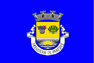 Shield Or with base wavy of Argent and Azure, issuant from base a bridge Sable, masoned Argent and having one arch, in chief a basket Sable, filled with grapevines Purpure leaved Vert at dexter, and a bunch of seven wheat ears Vert tied Argent at sinister. Mural crown Argent with four visible towers (town rank) and white scroll with inscription in black capitals "FREGUESIA DE PAREDES".