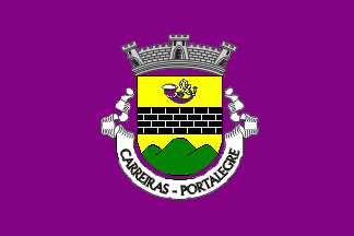 Shield Or, a fess Sable masoned Argent, in chief a hunting horn Purpure with cord Sable and mouth Argent, issuant from base a triplemount Vert. Mural crown Argent with three visible towers (village rank) and white scroll with inscription in black capitals "CARREIRAS - PORTALEGRE".