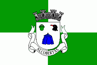 Shield Argent, a dolmen Azure topped by a crosslet of the same, in dexter chief a flagon Vert, in sinister chief a crow´s head Sable armed and eyed Gules. Mural crown Argent with four visible towers on both flags (town rank) and short white scroll, in Bénard-Guedes style, with inscription in black initials "ALCOBERTAS".