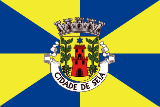 The arms are Or an embattled tower Gules masoned and port and windows Sable between two oaks Vert eradicated of the same and bellow a 6-point star Azure. Mural crown argent with five visible towers (city rank) and white scroll reading in black upper case letters scroll reading in black upper case letters "CIDADE DE SEIA".