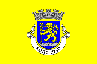 The arms are Azure, a Lion rampant Or, holding a crozier of the Same, in base a bar wavy Argent semy of wavelets Azure. Mural crown Argent with five visible towers (city rank) and white scroll reading in black upper case letters "SANTO TIRSO". António Martins-Tuválkin, 14 Mar 2007