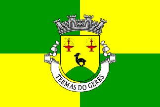 Termas do Gerês, also know as Caldas do Gerês or simply Gerês, was one of the former communes of Terras de Bouro Municipality affected by the 2013 changes. It had 1105 inhabitants in 2015 . It was elevated to the rank of a town on 16 August 1991. It is a town within the territory of this commune, whose nominal seat is however a village (and whose arms show a mural crown with only three towers). While there are a few other cases that could be described like that, Caldas do Gerês is, as far as I know, unique in that there was an official grant of flag and arms.