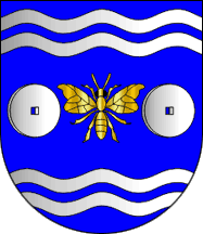 Shield Azure a bee Or, flanked by two millstones Argent between two barrulets gemel wavy Argent.
