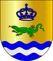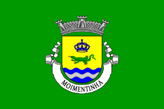 Shield Or a wall lizard Vert armed and langued Gules, in chief a Marian crown Azure gemmed Or, on base wavy Azure a barrulet wavy Argent. Mural crown Argent with three visible towers (village rank) and white scroll reading in black upper case serifed letters "MOIMENTINHA".