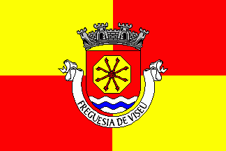 Shield Gules with base wavy of Argent and Azure, an octagon Or charged with an escarbuncle Gules of eight connected ropes with central knot. Mural crown Argent with four visible towers (town rank) and long white scroll, as used for united communes, reading in black upper case serifed letters "FREGUESIA DE VISEU".