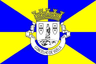 Shield Or with base wavy of Azure and Argent, issuant from base wavy a throughout bridge Sable masoned Argent, on chief a heraldic fountain, surrounded by a laurel wreath Vert fruited Or. Mural crown with five visible towers (city rank) and short white scroll, in Bénard Guedes style, with inscription in black initials "VIZELA".