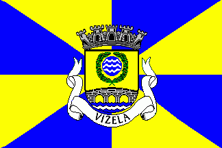 [At the municipality refoundation celebrations] there was also another flag in display: a diagonally quartered flag of yellow and blue (yellow in the hoist and fly and blue in the top and bottom), with a thin white bordering and the words "CONCELHO | DE | VIZELA" in white in the blue triangles ("concelho de" in the one at the top and "Vizela" in the one at the bottom).