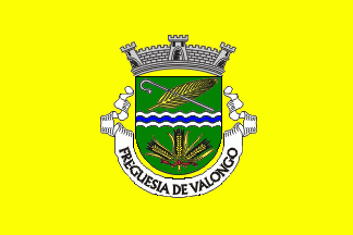 Shield Vert, a bar wavy Argent charged with a barrulet wavy Azure, in chief a shepherd's crook Argent and a palm frond Or in saltire, in base three wheat ears Or, tied Gules. Mural crown Argent with three visible towers (village rank) and white scroll with inscription in black capitals "FREGUESIA DE VALONGO"