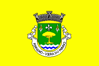Shield Vert with base wavy of Argent and Azure, an eradicated pine Or, in chief a fleur-de-lis Argent, flanked by two corn cobs Or leafed Argent. Mural crown Argent with three visible towers (village rank) and white scroll with inscription in black capitals "PINHEIRO - VIEIRA DO MINHO".