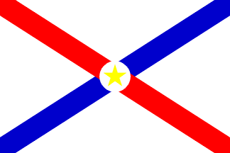 In case of the square jack the white disk covers entierly the crossing part of the diagonals. Here this can’t be done so that the disk does not reach into white field (unless the disk being eliptical, which is probably not the case). This poses the question which diagonal is in front of the other. The Album [pay00] shows, just as I follow, the red in font of the blue, and the disk slightly larger then the smallest intersection part, so reaching a bit into white field (whithout any visible fibriation - the effect of apliqueing of the disk on the flag might provide decent distinction).