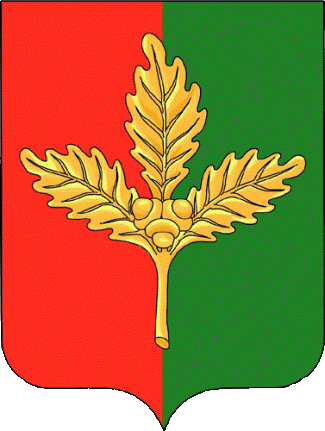 On a divided red and green field, a golden oak branch of three leaves, connected by petioles, with three acorns.