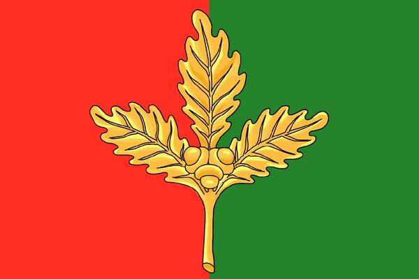 A rectangular cloth with a 2:3 aspect ratio, consisting of two equal vertical stripes of red and green, with an image in the center of a yellow oak branch with three leaves connected by petioles, with three acorns.