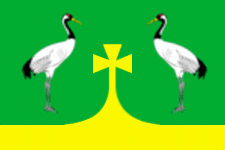 A rectangular green cloth with a width-to-length ratio of 2:3, bearing along the lower side a yellow stripe (1/6 the width of the cloth), having a ledge in the middle ending in a cross; on either side of the cross is a pair of cranes.