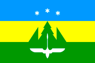 The flag was adopted by City parliament on 6, September, 2000. Author of design was E. Ûrhin. The flag consists of three horizontal equal stripes: blue, white and green. Three white snow-flakes and flying crane (стерх) placed in canton. Ratio 2:1