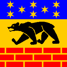 Blazoned in English: "Party per fess of Azure semy of mullets Or, and Or a bear Sable armed and langues Gules, and Gules masoned Or."