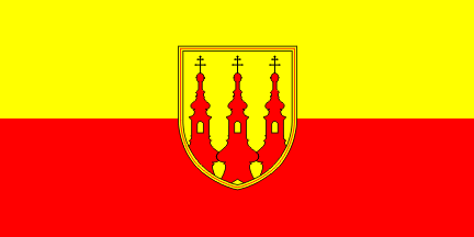 The flag is divided yellow-red with the municipal coat of arms set in the middle. The horizontal and vertical versions are prescribed, both in proportions 1:2. The width of the coat of arms is half width of the flag, placed vertically in both version.