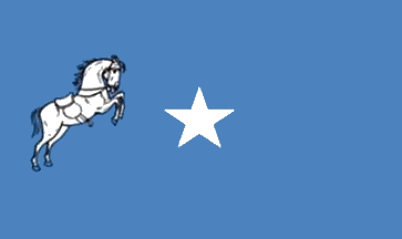The flag of Juba and Shabelle is white over green with blue triangle bearing a white star at hoist. In the white part near the hoist is a circle of nine dark red or maroon stars and in the part near the fly a tree. In the base of tree, from left to below part, an undulated line of light blue, and from the right to the below part other undulated line of light blue. There’s a Facebook page for this state with a pair of drawings of the flag (ratio c. 1:3), but still no photograph to confirm.