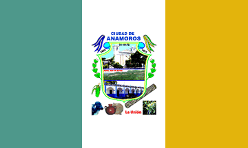 vertical green-white-gold charged with Coat of Arms. Photo at