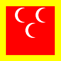 Commander of the privateers (?). Square red field with a yellow border and three white crescents facing the fly (2 + 1). 1:1. [Privateers were officially appointed by governments to capture foreign ships. They were ancestors of world companies, more or less :-)]