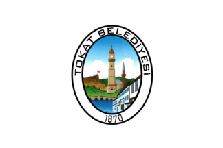 The flag of Tokat, used horizontally (photo, photo) or vertically (photo), is white with the municipality's emblem. The flag is also used with a blue background (photos). "Belediyesi" means "Municipality".