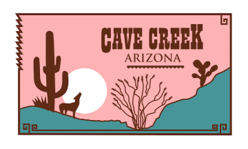 coppery yellow sun in the foreground. Running the entire width of the seal and bisecting it completely is a brown bar with the words 'Cave Creek' in an Old West type face and. All in all, a very striking emblem.