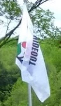 The flag is a white field with the community logo, just underneath black wording of the community's name.