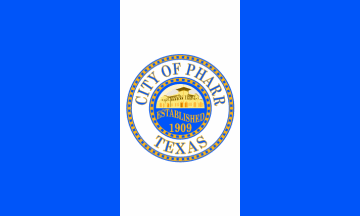 The previous flag of the City of Pharr, Texas, was white with city seal on it and two borders - blue and yellow. The flag was designed in July 2009. Information and flag image thanks to Gary Rodriguez from the City Administration.